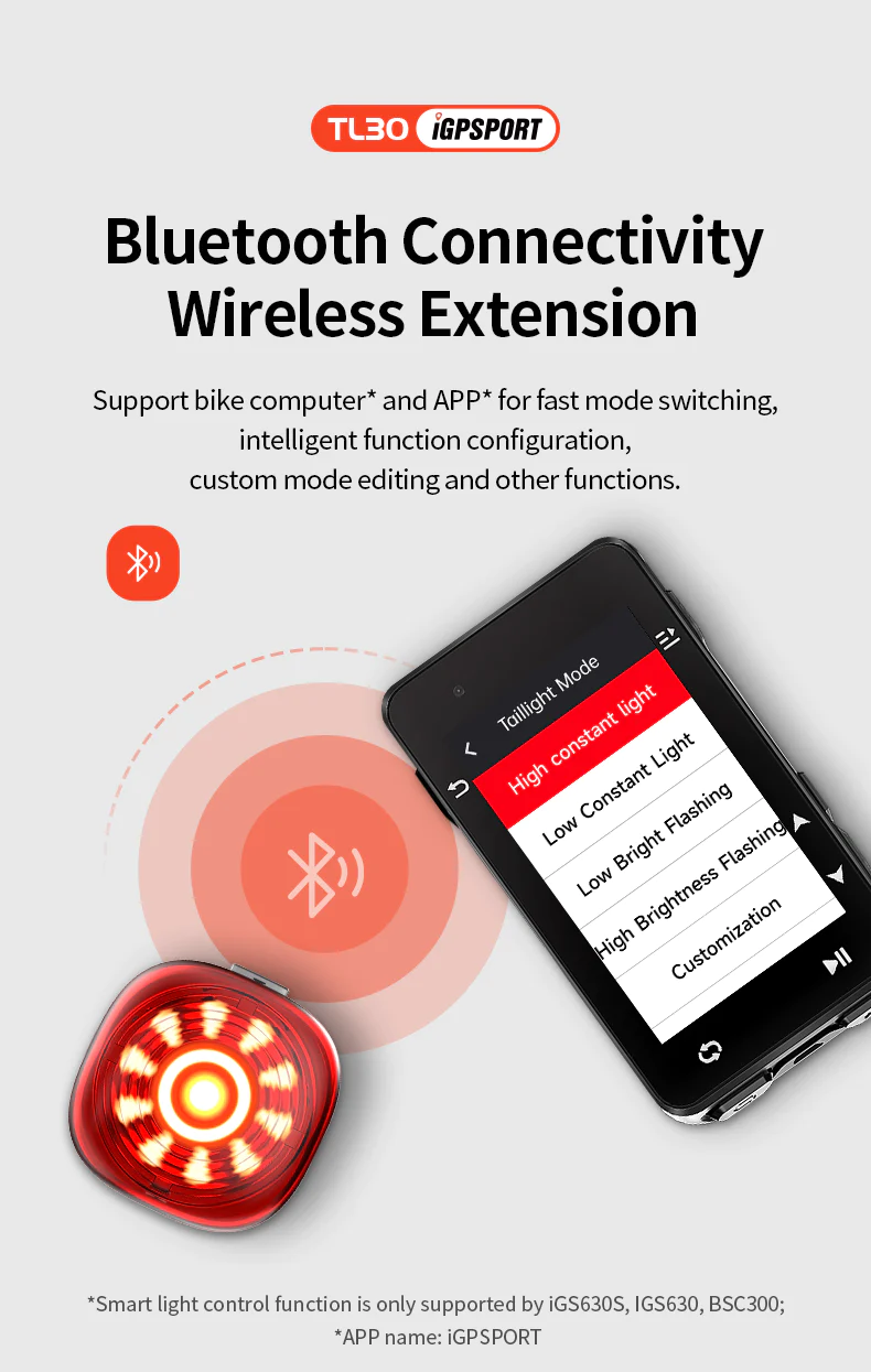 With its added Smart functionality you can connect to IGPSport bike computers (630, 630S and BSC300), allowing you to select light settings directly from the computer. You can also connect the light to your mobile phone and choose light settings. The light can also be controlled with the button on the light.